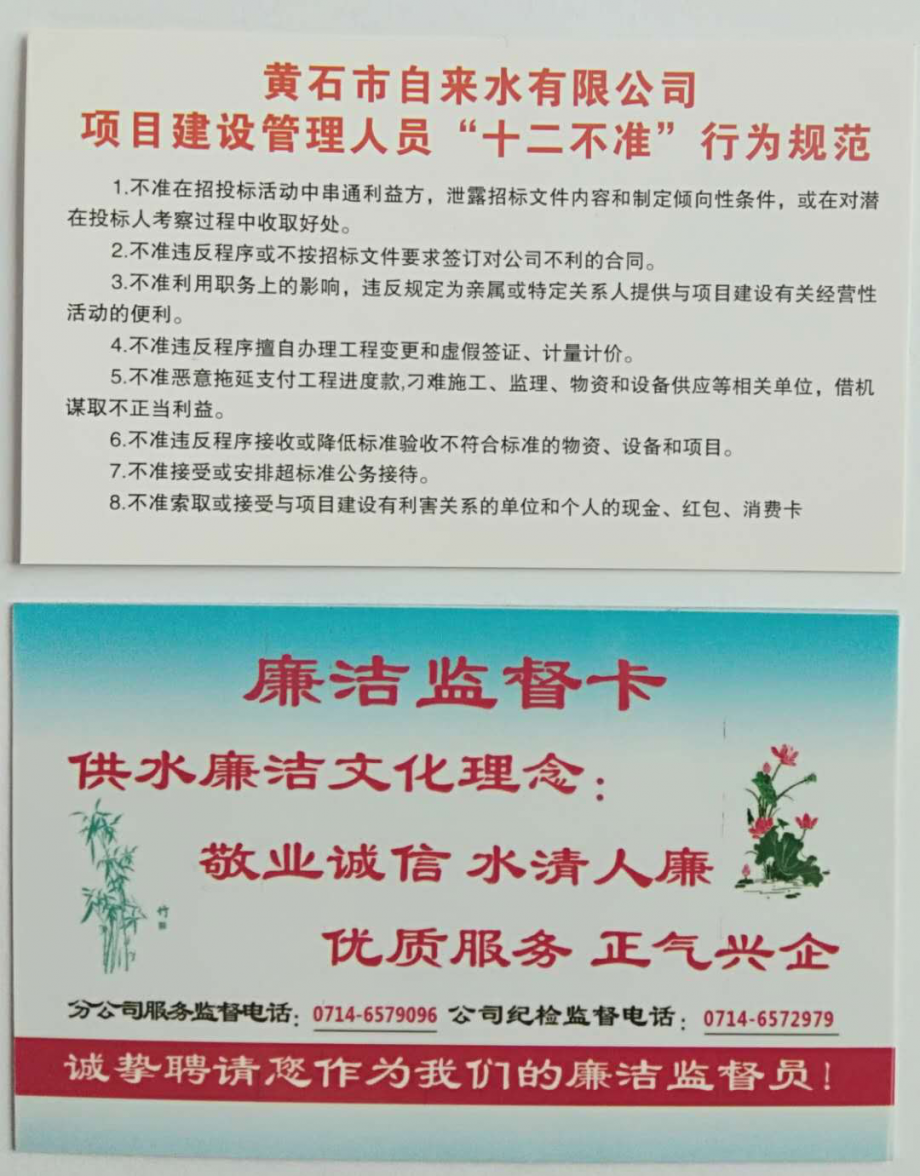送廉助廉:到建設(shè)工地發(fā)放《“十二不準(zhǔn)”行為規(guī)范》廉潔小卡片,向落戶企業(yè)送《供水服務(wù)廉潔監(jiān)督卡》,與經(jīng)濟(jì)合同雙方協(xié)簽定《廉潔共建協(xié)議書》,同職工家屬簽訂《家庭助廉協(xié)議書》,共建廉潔防線。