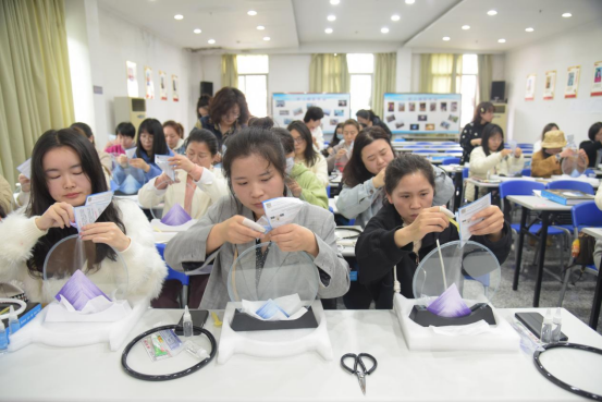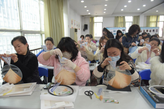 活動開始,在聽完手作老師關于流沙畫制作過程的介紹,參與活動的女職工們迫不及待開始投入沙畫的創(chuàng)作。將細小的砂礫晶體從兩塊透明玻璃之間的小孔內一點點注入,待向玻璃之間注入凈水、封口后,一副層次分明、變化萬千的“治愈系”的沙畫便制作完成了。