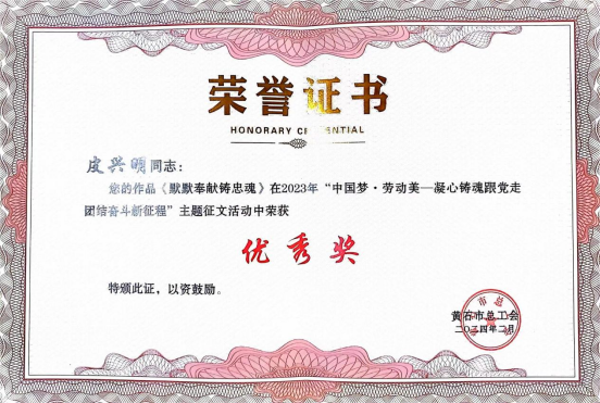 經(jīng)專家組評(píng)議,王家里水廠職工皮興明的“默默奉獻(xiàn)鑄忠魂”榮獲優(yōu)秀獎(jiǎng)。