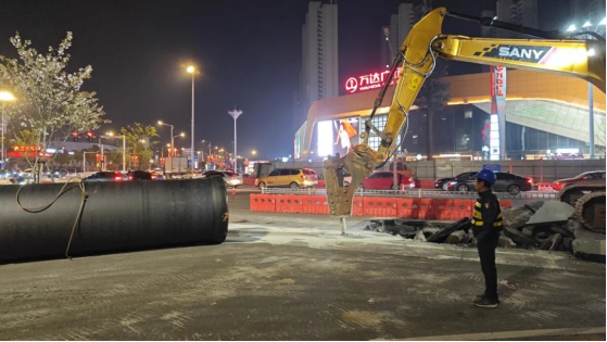 由于該施工現(xiàn)場(chǎng)屬于城市要道,車輛、來(lái)往行人多,交通壓力大,施工必須趕在夜間完成,早上6點(diǎn)前需要開放交通,施工時(shí)間極其緊迫。為盡快還路于民,減小對(duì)市民上下班及生活的影響。前期,市水務(wù)集團(tuán)工程公司多次組織技術(shù)人員深入現(xiàn)場(chǎng)勘察,科學(xué)研判,制定詳細(xì)的遷改方案。當(dāng)晚22時(shí),交通圍堵完成后,工程公司組織精兵強(qiáng)將,增配多臺(tái)機(jī)械設(shè)備同時(shí)投入戰(zhàn)斗。