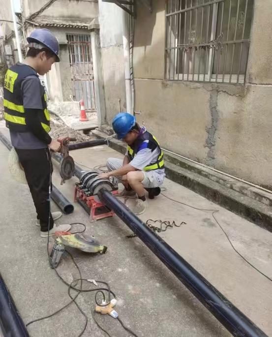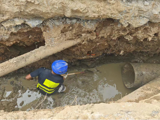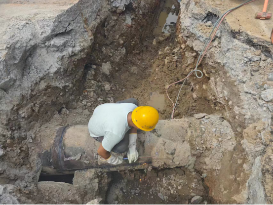 而與此同時(shí),20多公里外,廣州路DN600供水管道遷改項(xiàng)目施工現(xiàn)場。工人們正在清理溝槽、焊割工對施工的管件進(jìn)行切割。。。。。。各工序正有條不紊的推進(jìn)。