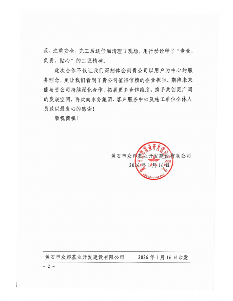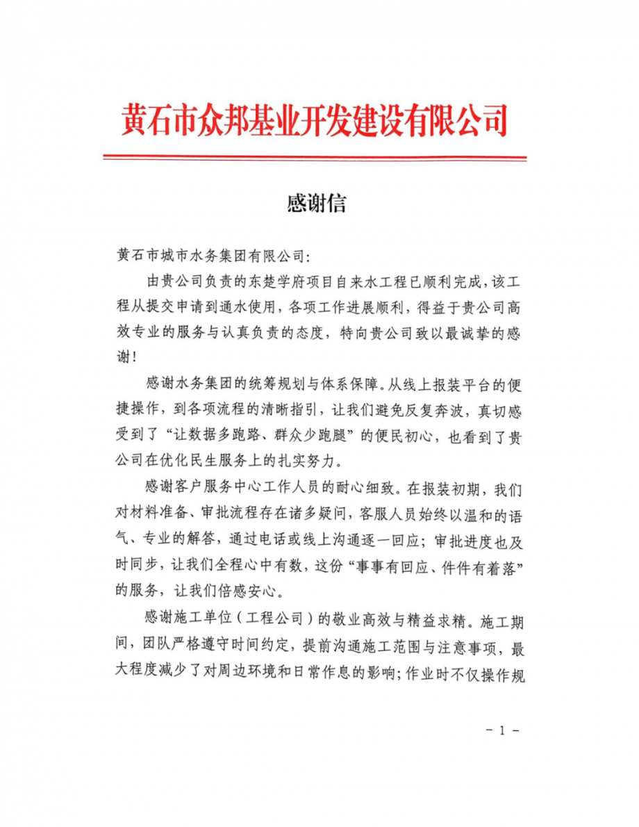 近日,市水務(wù)集團(tuán)收到了眾邦基業(yè)開發(fā)公司發(fā)來的感謝信,字里行間滿是對(duì)東楚學(xué)府報(bào)裝接水項(xiàng)目工作的認(rèn)可與贊譽(yù)。這份真摯的感謝,不僅是對(duì)水務(wù)集團(tuán)工作的肯定,更是水務(wù)集團(tuán)踐行兩會(huì)精神、深耕民生服務(wù)、優(yōu)化營商環(huán)境的生動(dòng)縮影。