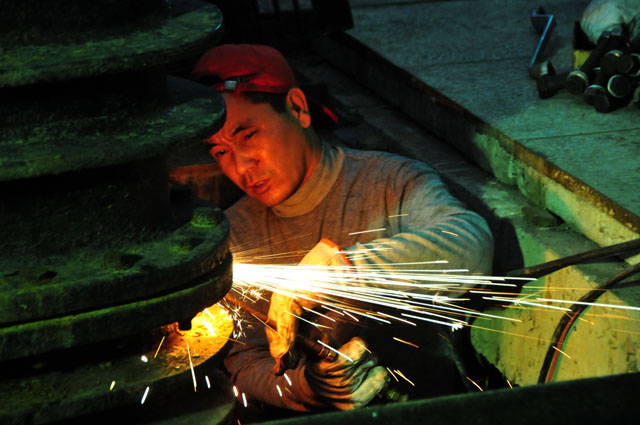 如圖:檢修人員正在拆卸取水機組進水閥門。