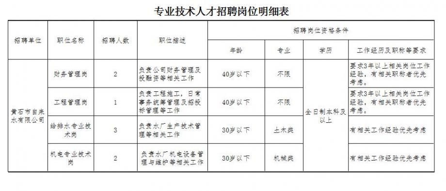 報(bào)名者應(yīng)符合《黃石市自來(lái)水有限公司專業(yè)技術(shù)人才招聘崗位明細(xì)表》(以下簡(jiǎn)稱《崗位表》)規(guī)定的年齡、專業(yè)、學(xué)歷等各項(xiàng)要求。